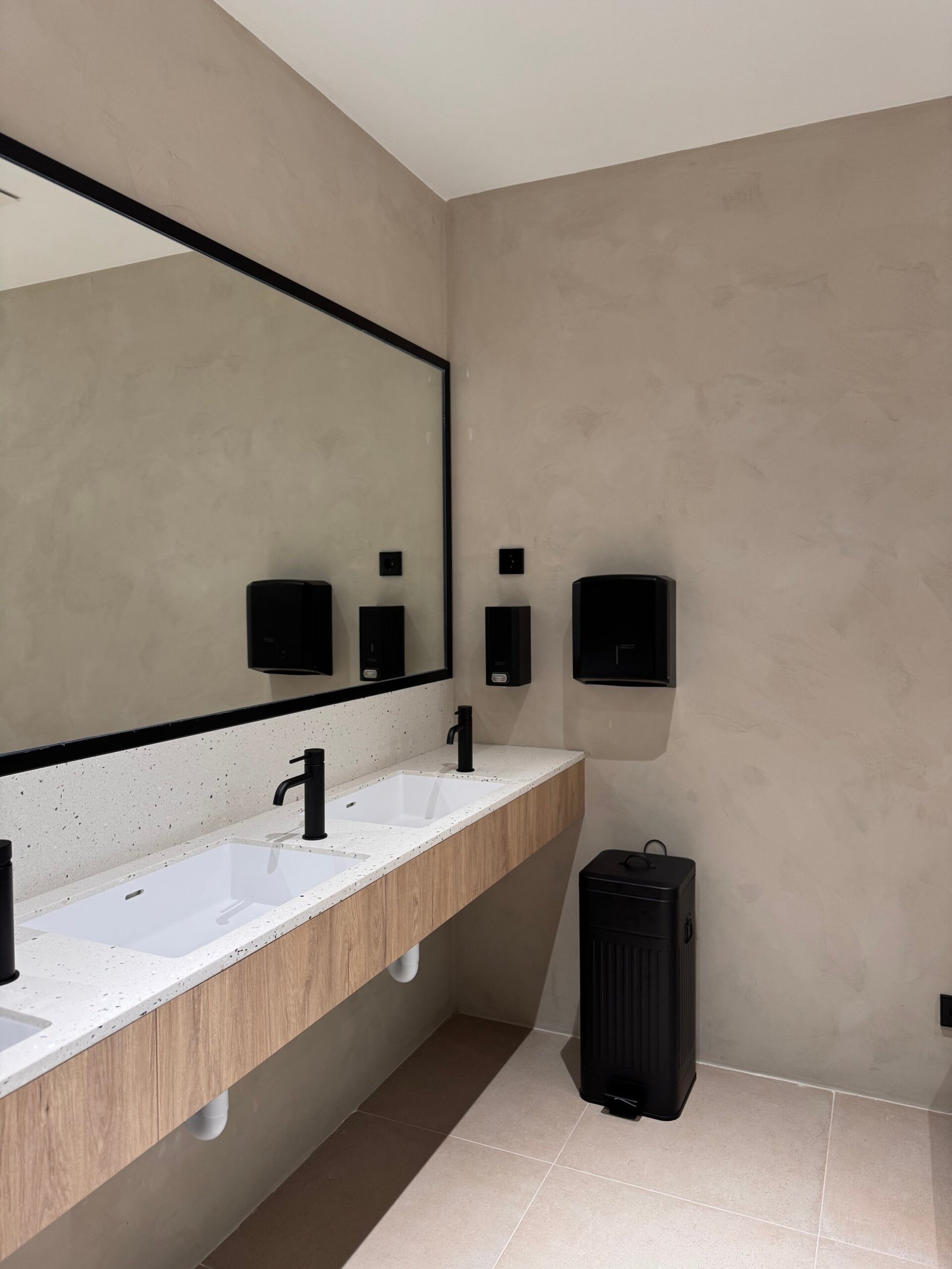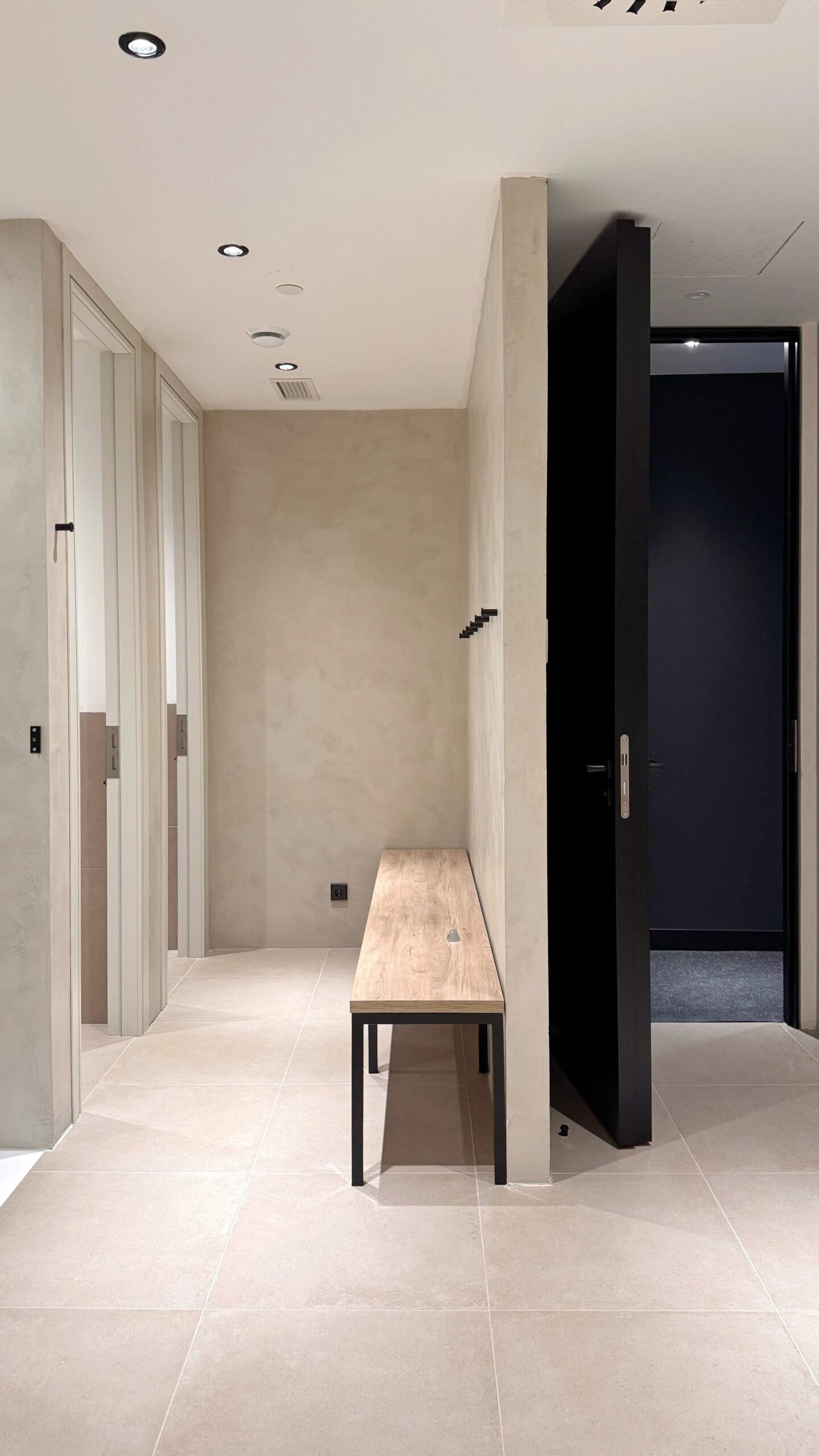 Como extensión de la naturaleza del jardín, en la sala de máquinas empleamos materiales pétreos y cálidos que también se prolongan hasta los vestuarios, donde los paramentos verticales en TOPCRET con acabado de microcemento simulan el interior de una cueva. Los lavabos están diseñados como una única pieza realizada en Hi-Macs, material higiénico y pensado para alto tránsito en lugares los vestuarios.