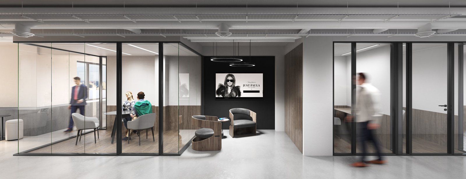 Para realzar las gafas, diseñamos expositores en acabado neutro con pies centrales revestidos de espejo. De esta manera, los pies reflejaban el suelo y creaban la ilusión de que el expositor estaba flotando.