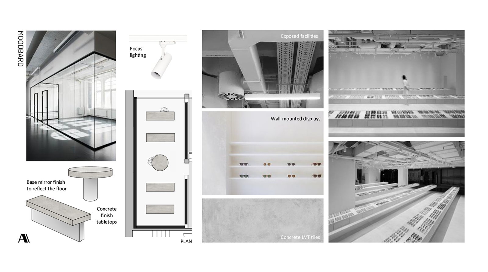 Este proyecto, que finalmente no ejecutamos, planteaba dejar el espacio con las instalaciones vistas y mesas de exposición en hormigón pulido y neutro.