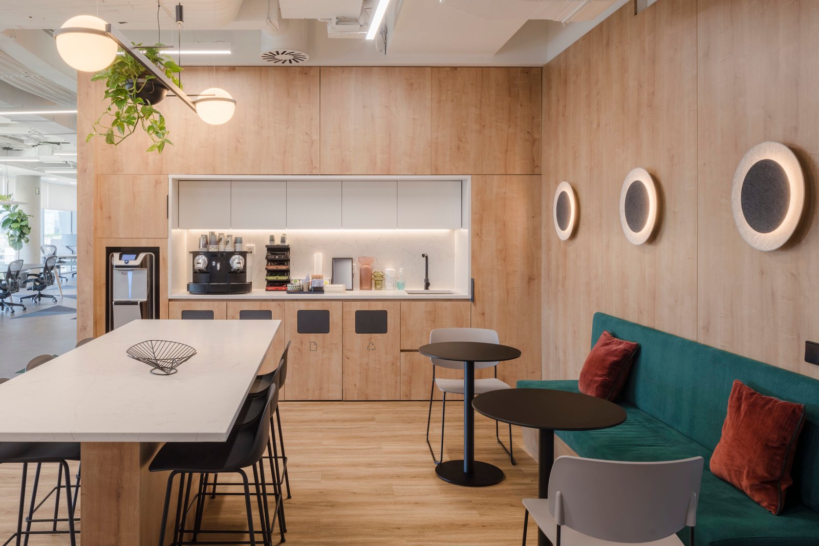 Para asegurar el confort acústico requerido en cada zona, empleamos revestimientos acústicos en las paredes de salas de reuniones y paneles fonoabsorbentes suspendidos del forjado en zonas de trabajo en abierto.