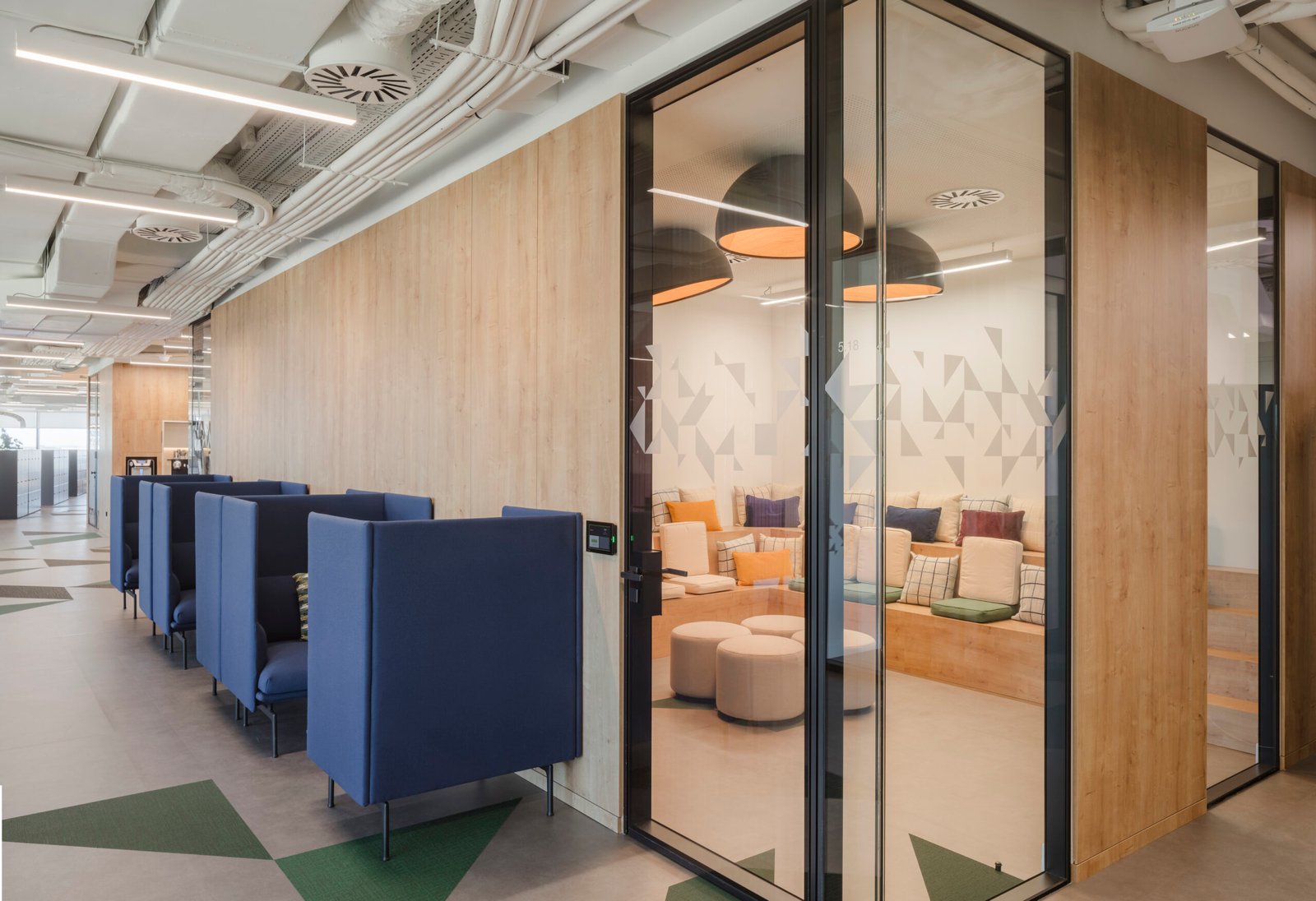 Los espacios de trabajo se diferencian mediante el empleo de formas geométricas en otros colores y el empleo de diversos materiales. Por ejemplo, los techos suspendidos de lamas de madera delimitan zonas especiales, como la recepción o el espacio polivalente de reunión.