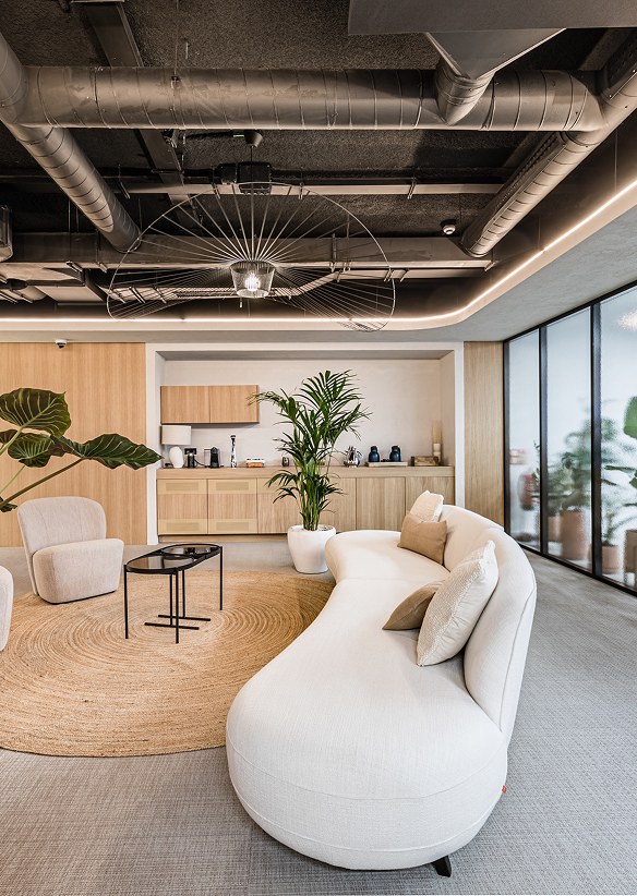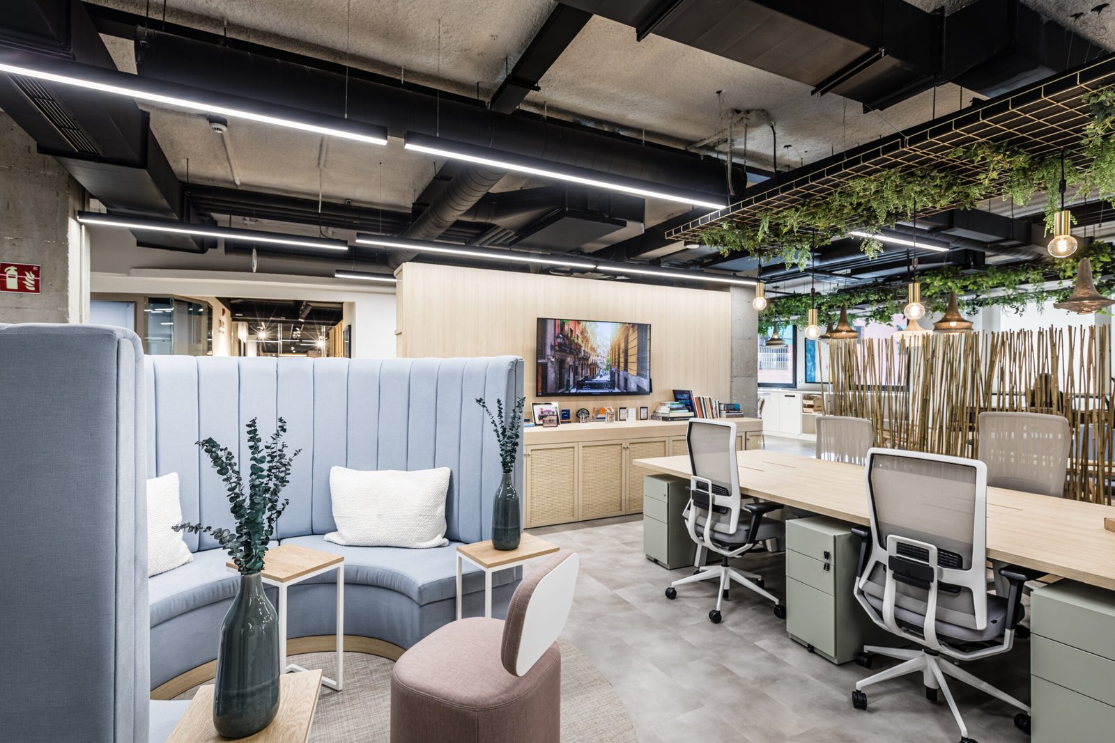 Por último, para conseguir el nivel de sonido ambiental deseado, aplicamos un proyectado acústico en los forjados que, en las zonas de trabajo en abierto, pintamos en beige para dar la sensación de amplitud y mayor altura.