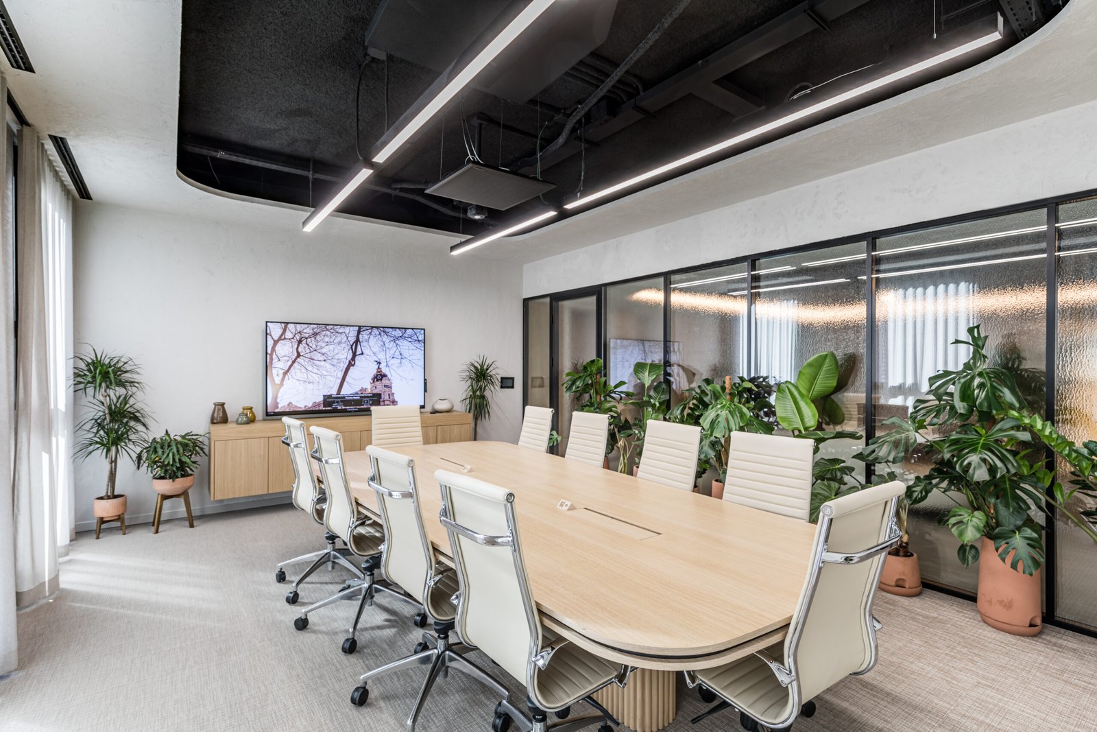 En cuanto al interiorismo de oficina, compenetramos diferentes elementos para crear un ambiente de trabajo sereno y elegante: sofás a medida tapizados de tejidos de Casamance; credenzas y mesas de reunión en madera de hoja de roble natural; puertas de armarios en rafia; notas de color de pintura contemporánea y detalles en cuero.