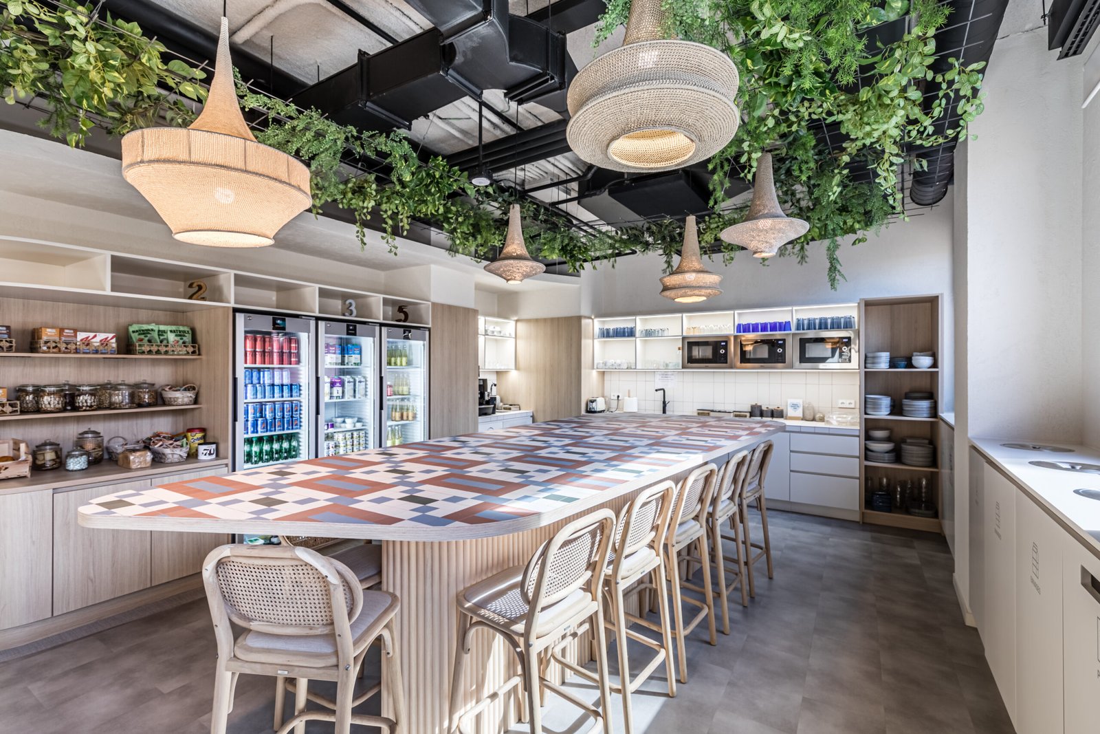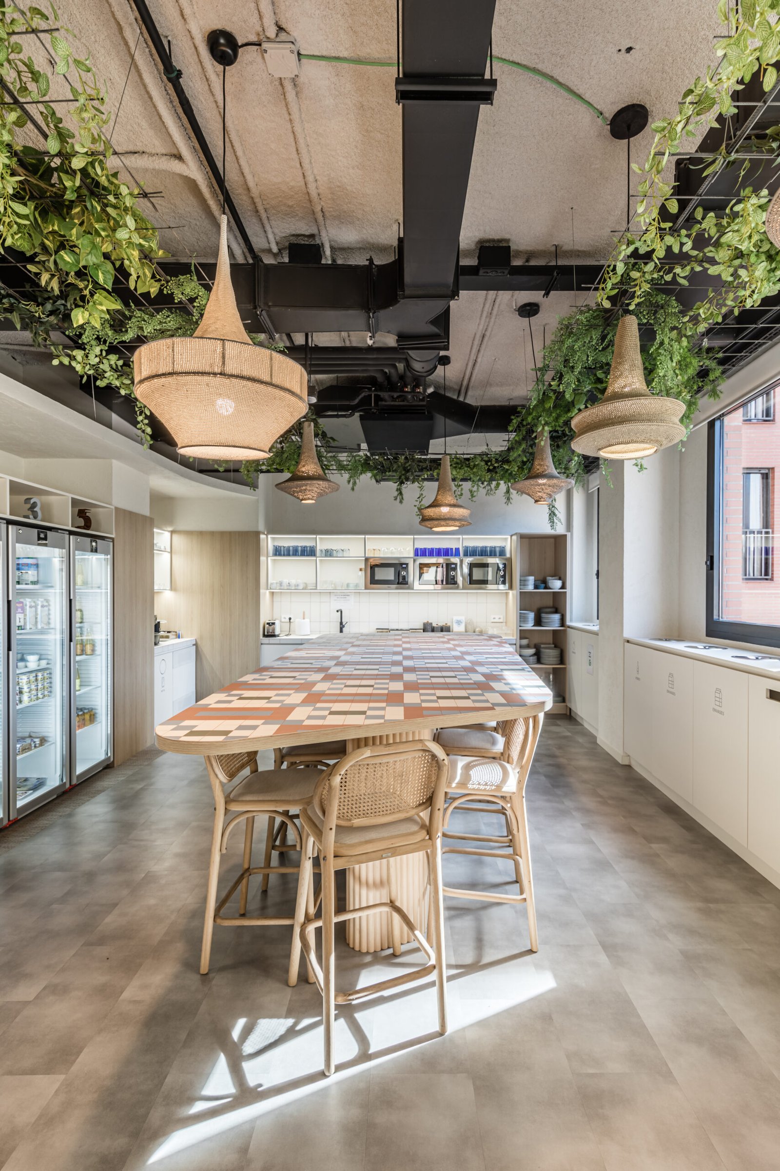 Además, dotamos a la oficina de una cantina para la que diseñamos la mesa central, con tapa de piezas cerámicas de Wow Design y pie revestido en listones de madera natural.