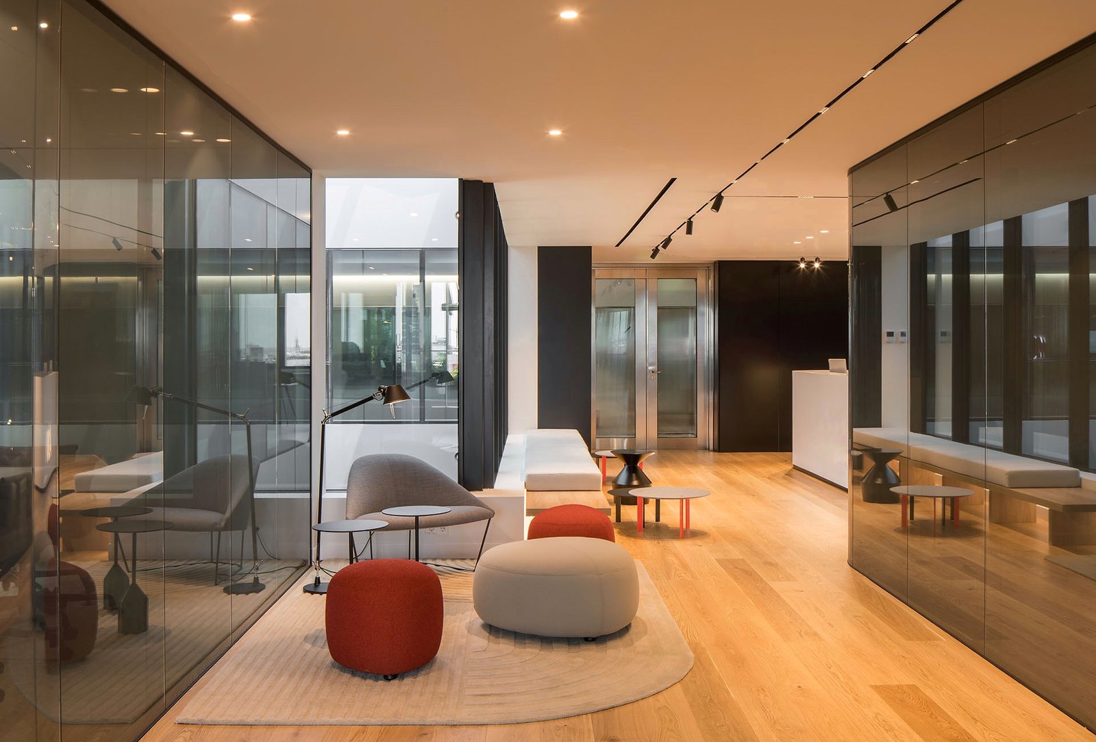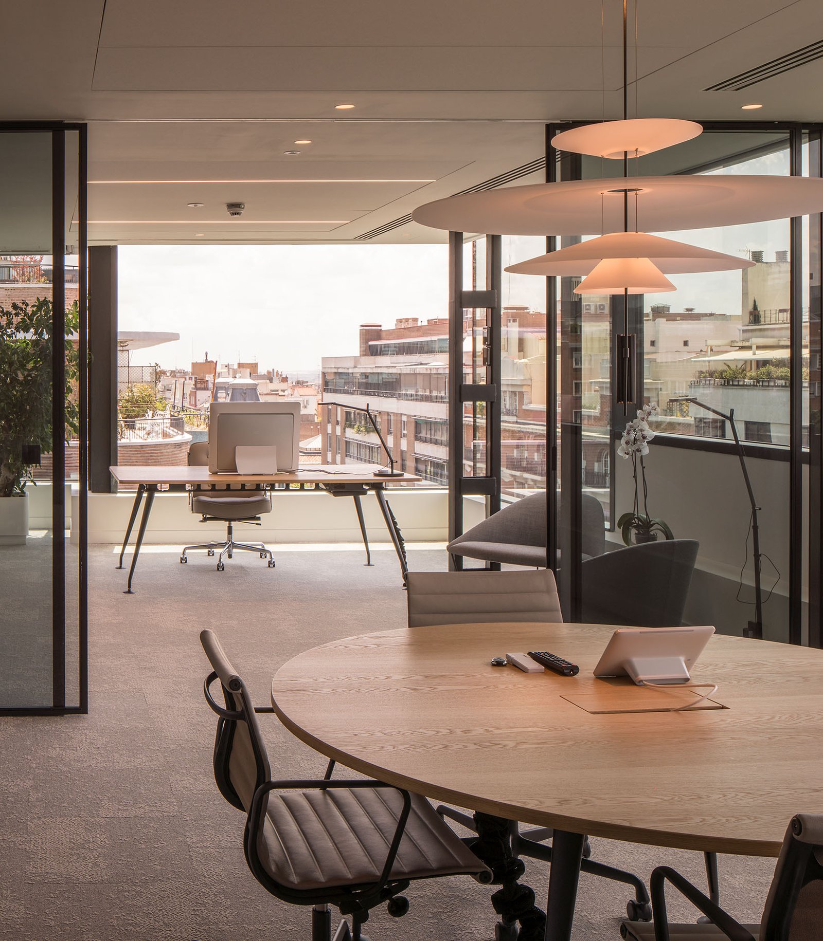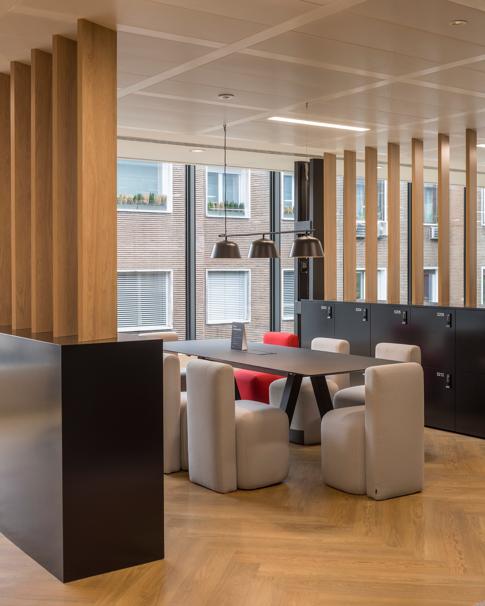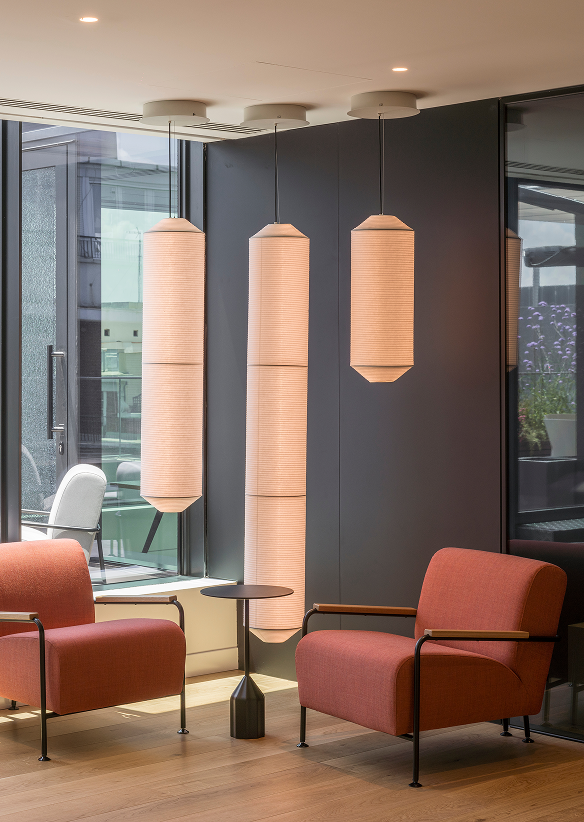 Las ligeras luminarias de Vibia y los volúmenes del mobiliario de Vitra, Muuto y Viccarbe dialogan con las proporciones de los espacios y del edificio.