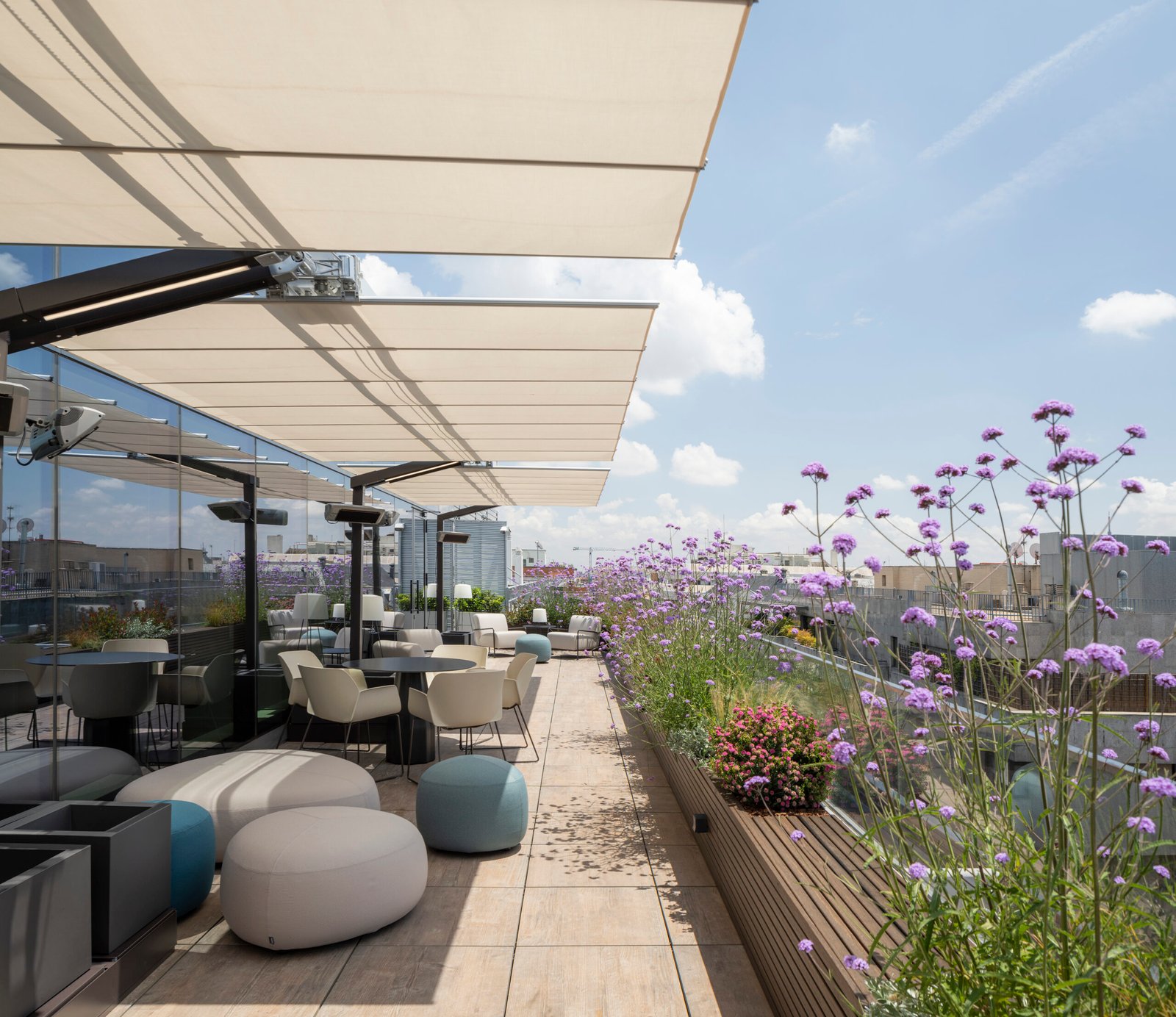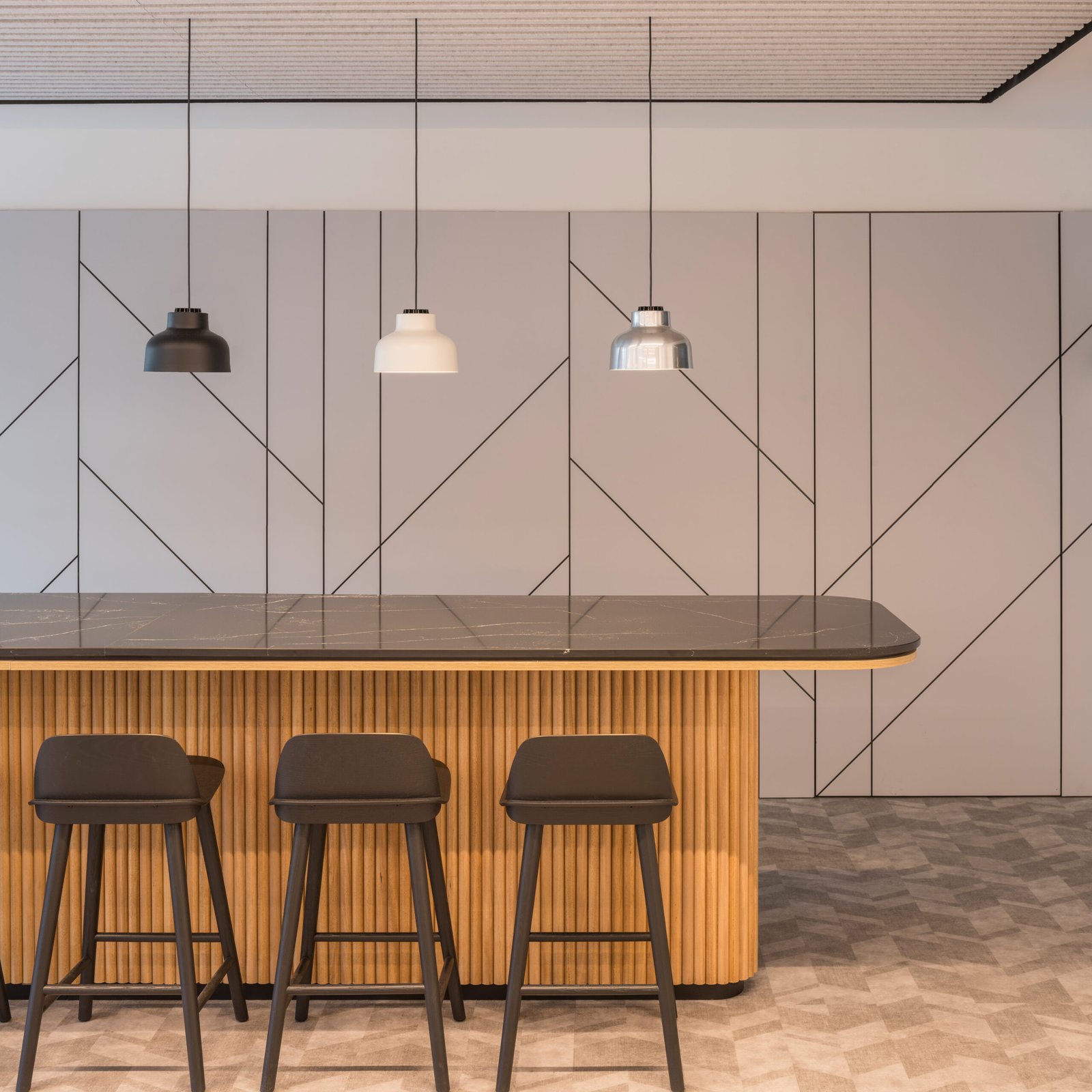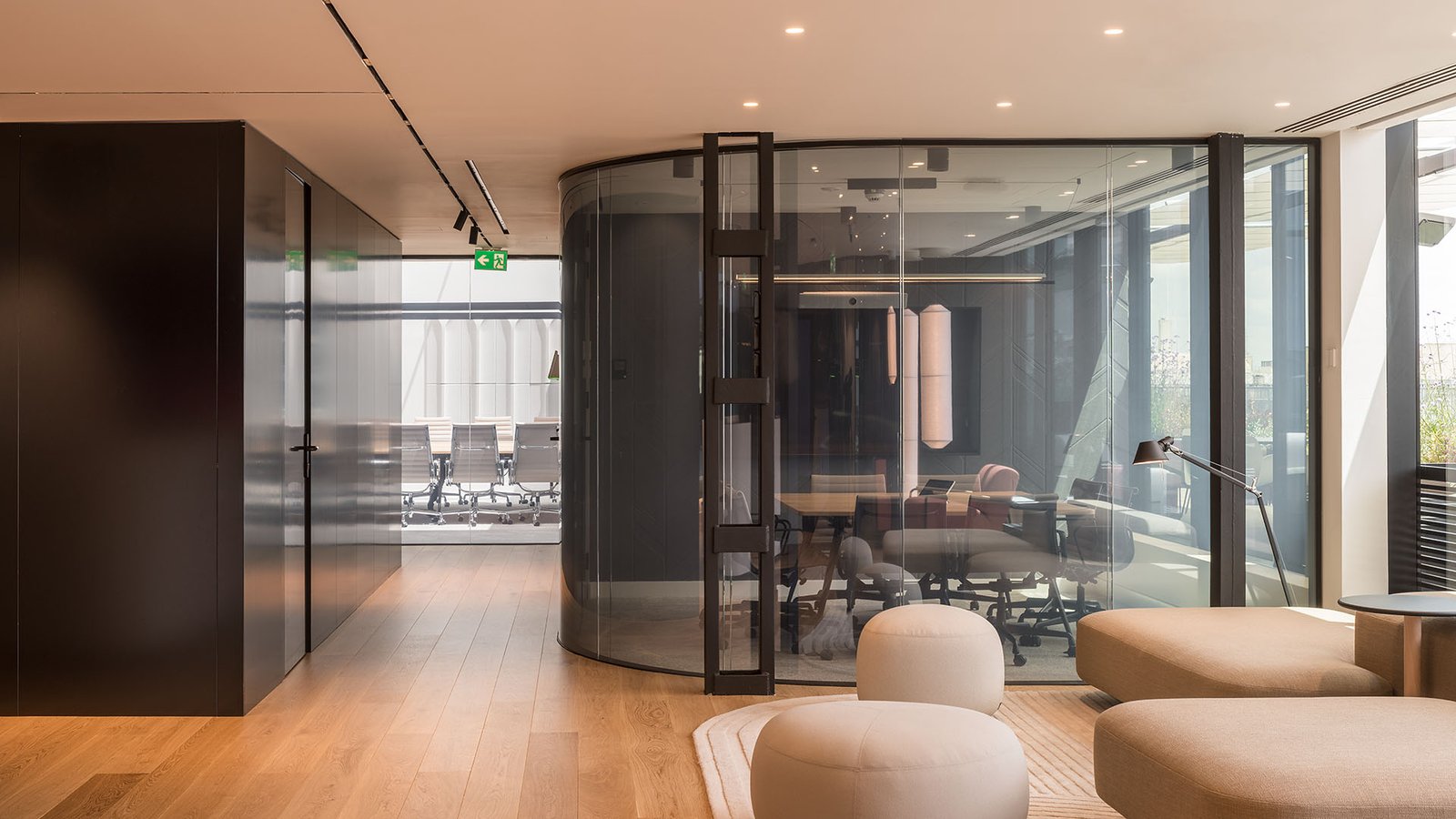 Las ligeras luminarias de Vibia y los volúmenes del mobiliario de Vitra, Muuto y Viccarbe dialogan con las proporciones de los espacios y del edificio.