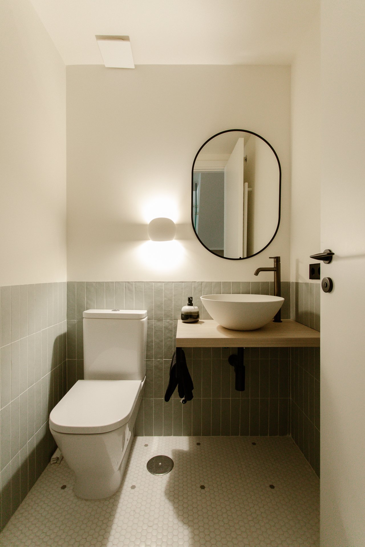 Por otro lado, retiramos las pesadas y oscuras puertas correderas que separaban el salón del distribuidor, que impedían el paso de la luz y ocupaban mucho sitio. Al eliminarlas, pudimos incorporar en su lugar un aseo de cortesía con un alicatado de Harmony en tono verde aguamarina en sintonía con las teselas diseminadas del solado de Hisbalit.