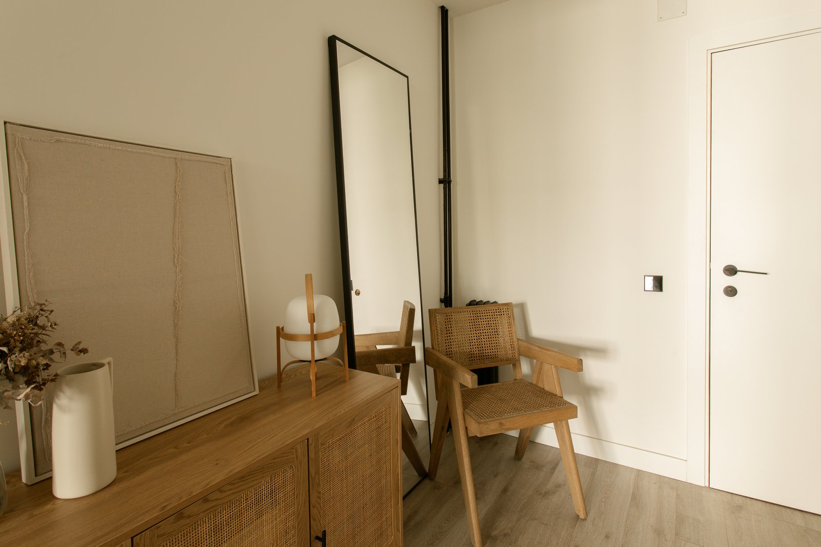 El resto del interior lo diseñamos sobre la base de una paleta neutra —maderas y tonos suaves— y texturas y acabados evocadores de la naturaleza que generan un acogedor ambiente y conectan con la personalidad de nuestra clienta. Esta base neutra se complementa con las notas de terracota y verde caqui y, la silla en tono chocolate, pensada para exterior, se une al conjunto aportando contraste.