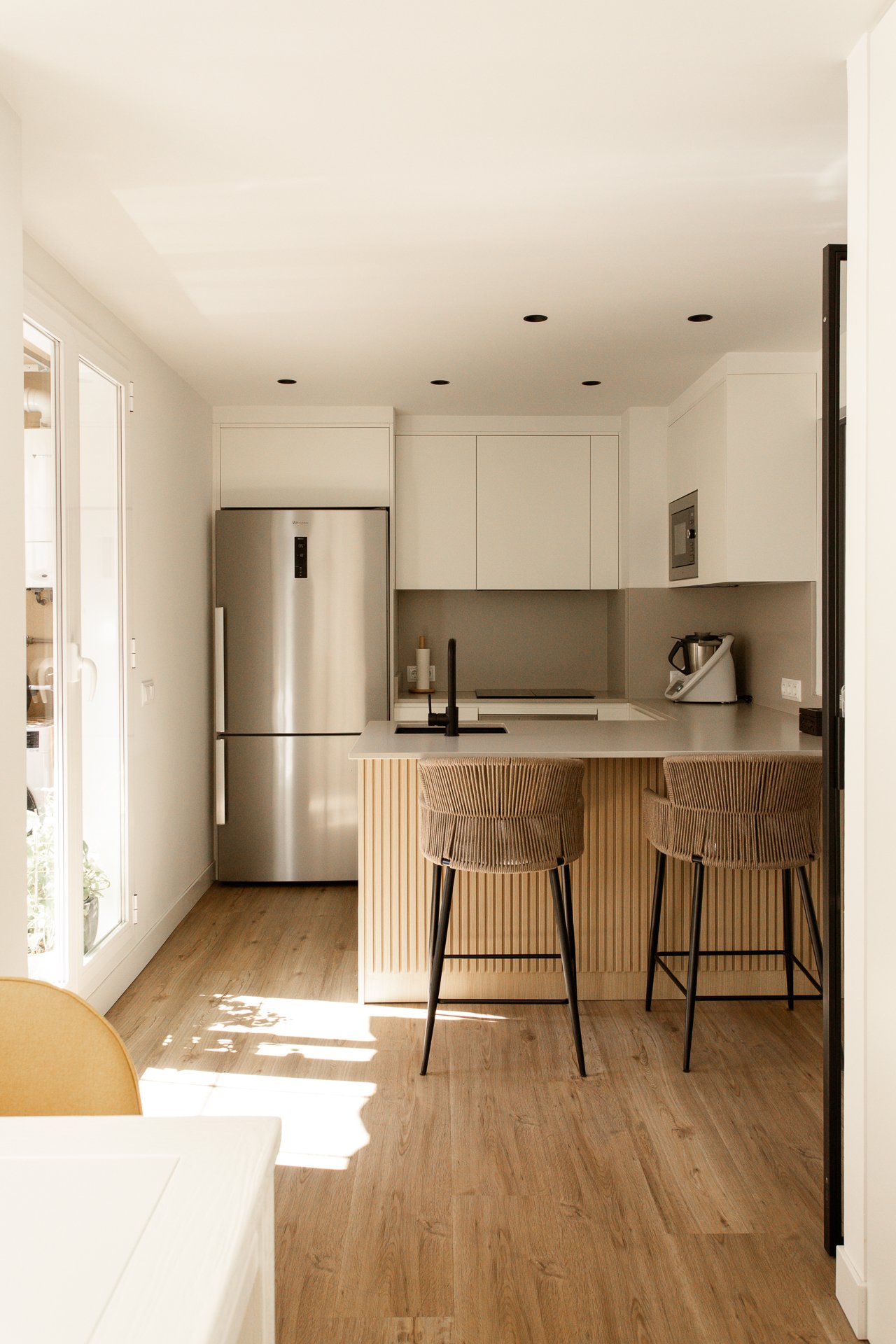 En cuanto al diseño, adoptamos líneas sencillas y minimalistas que incorporan texturas, como la cálida palillería que reviste la península de la cocina, rematada con una fantástica encimera grisácea de Silestone.