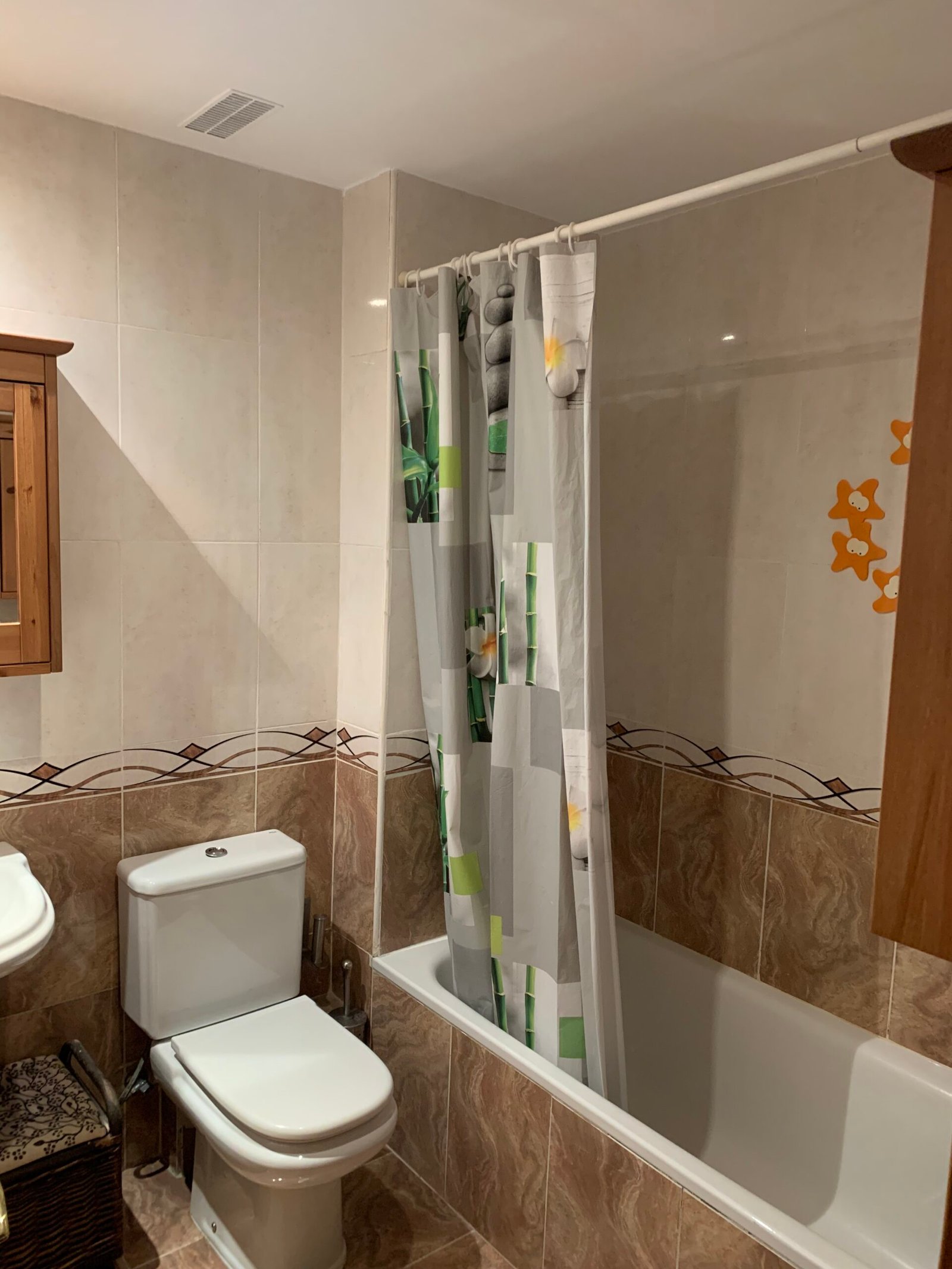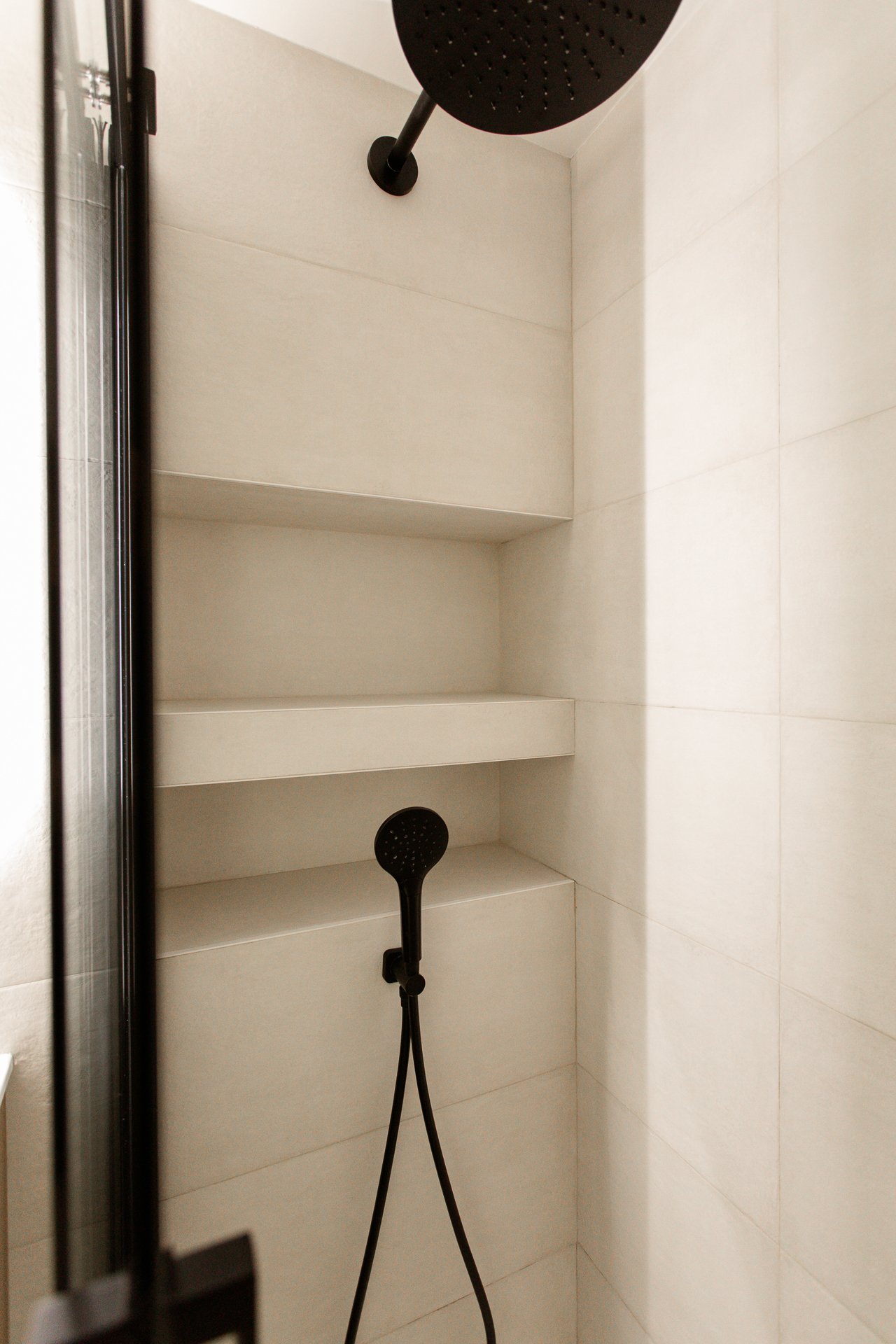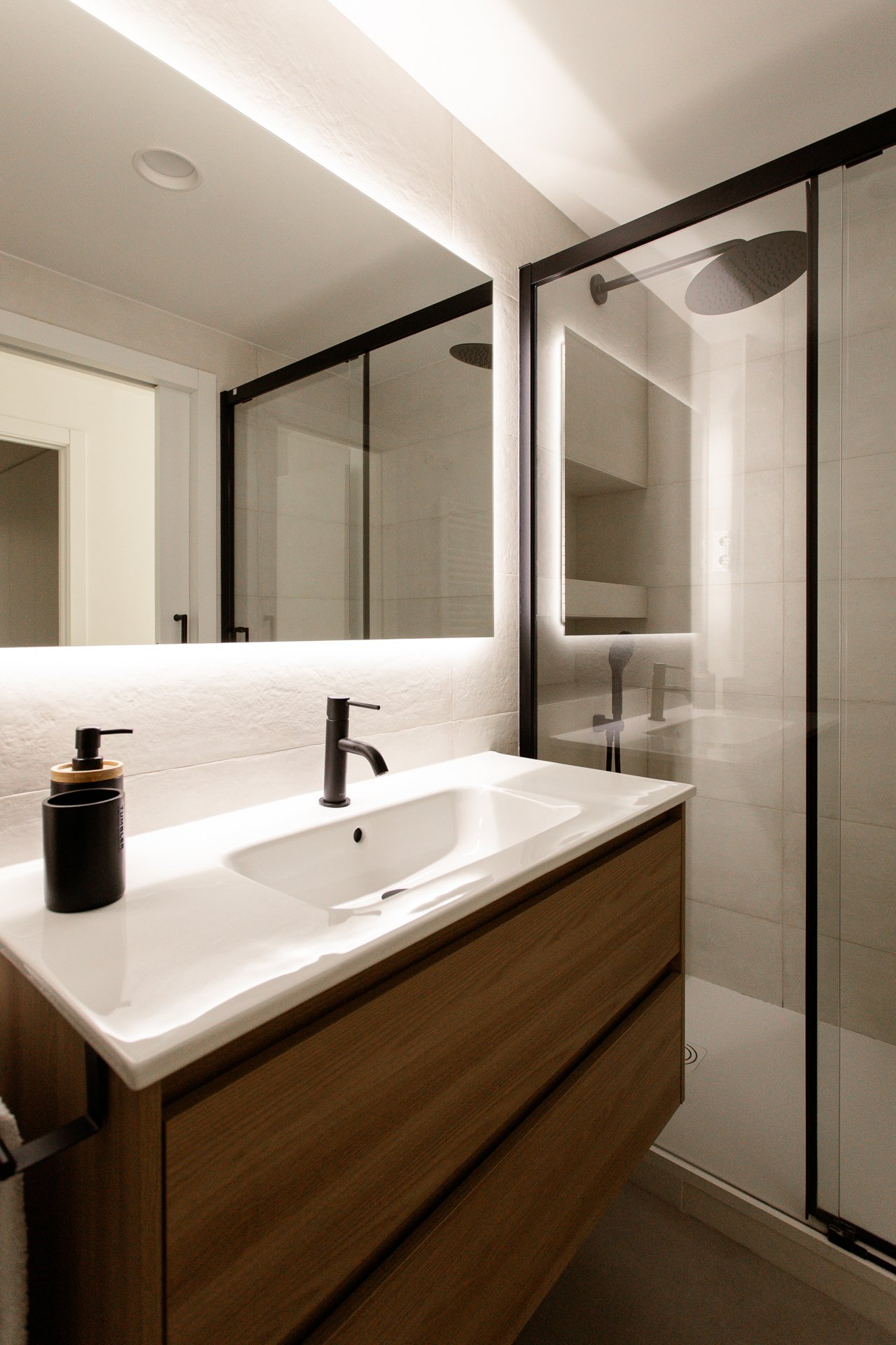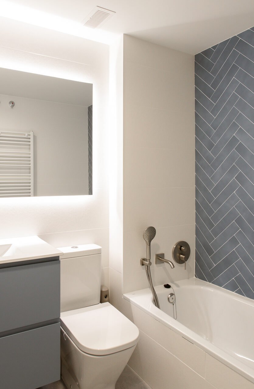 Distinguimos cada uno de los baños con su propia combinación de tonos, formas y texturas. En el secundario, el azulado alicatado en espiga dialoga con el mueble de lavabo del mismo tono. Y, en el principal, las piezas cerámicas de Marazzi —con una textura que recuerda a la piedra caliza— combina a la perfección con el mueble de madera de nogal.